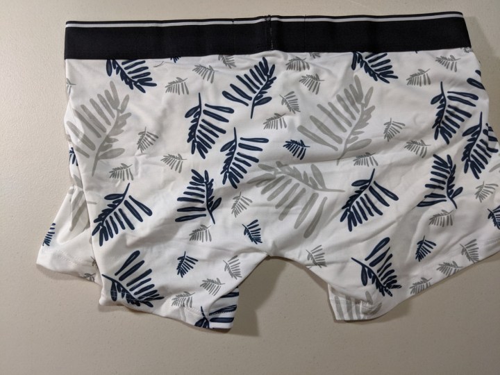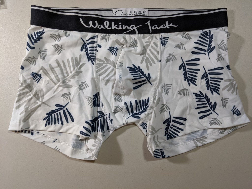 The Walking Jack underwear. The Fern Print collection has a fabric composition of 90 percent polyester and 10 percent Elastane. The fabric feels really soft and the stitching is neat. The Fern Print trunk almost has a boxer-brief type fit, which is perfect for me.