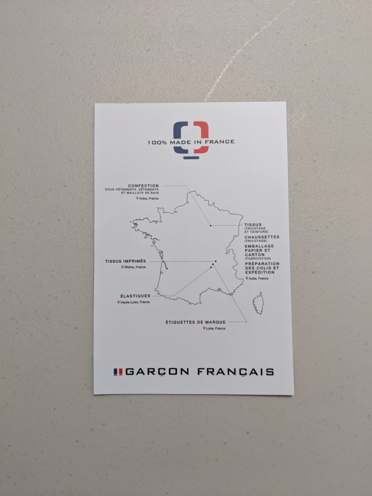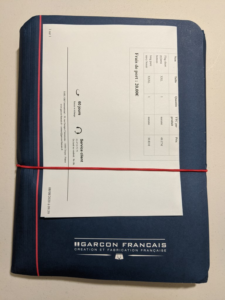 The order arrived in a brown padded envelope. Inside there was a blue paper folder with a red elastic band with the invoice. The clothes were neatly folded inside with a card showing where parts of the clothing were sourced in France and care instructions. I commend the brand for the efficient use of resources in lower use of packaging materials.