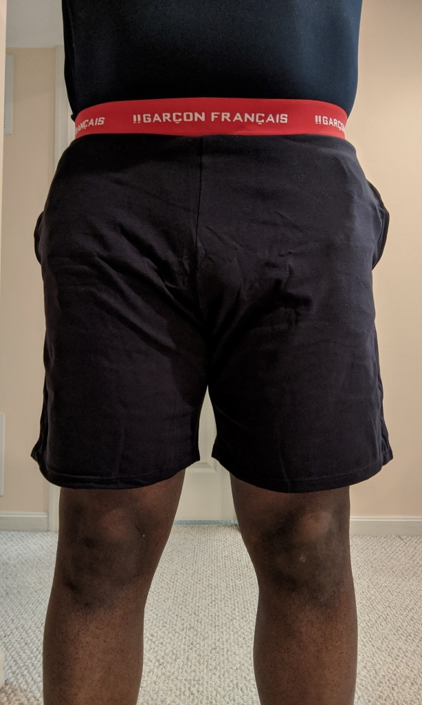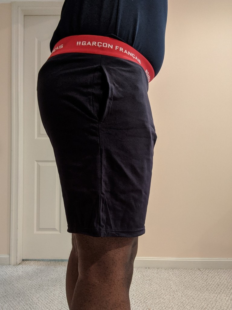 I selected the dark blue shorts, called the “flag short pyjama bottom,” and a pair of the navy boxers (not reviewed here). The sizing in European sizes tends to be a bit smaller than US sizes. So, it was wonderful that Garcon Francais provides a convenient link to its size chart. My size was available as XXL (36-inch waist). The largest size available is XXXL (38-inch waist).