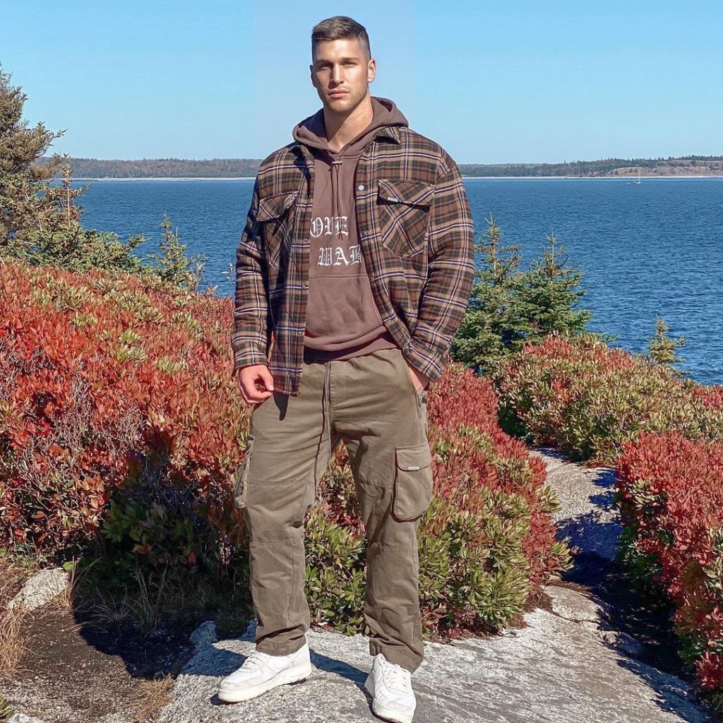 Instagram influencer, Kyle Hynick, started a page where he wears different outfits. In the photos with overshirts, Kyle wears flannel shirts with customized embroidery and plaid jackets. He wears an overshirt with a graphic tee and cargo pants or jeans. It is a well-styled, relaxed rugged combination, perfect for weeknights or weekends.